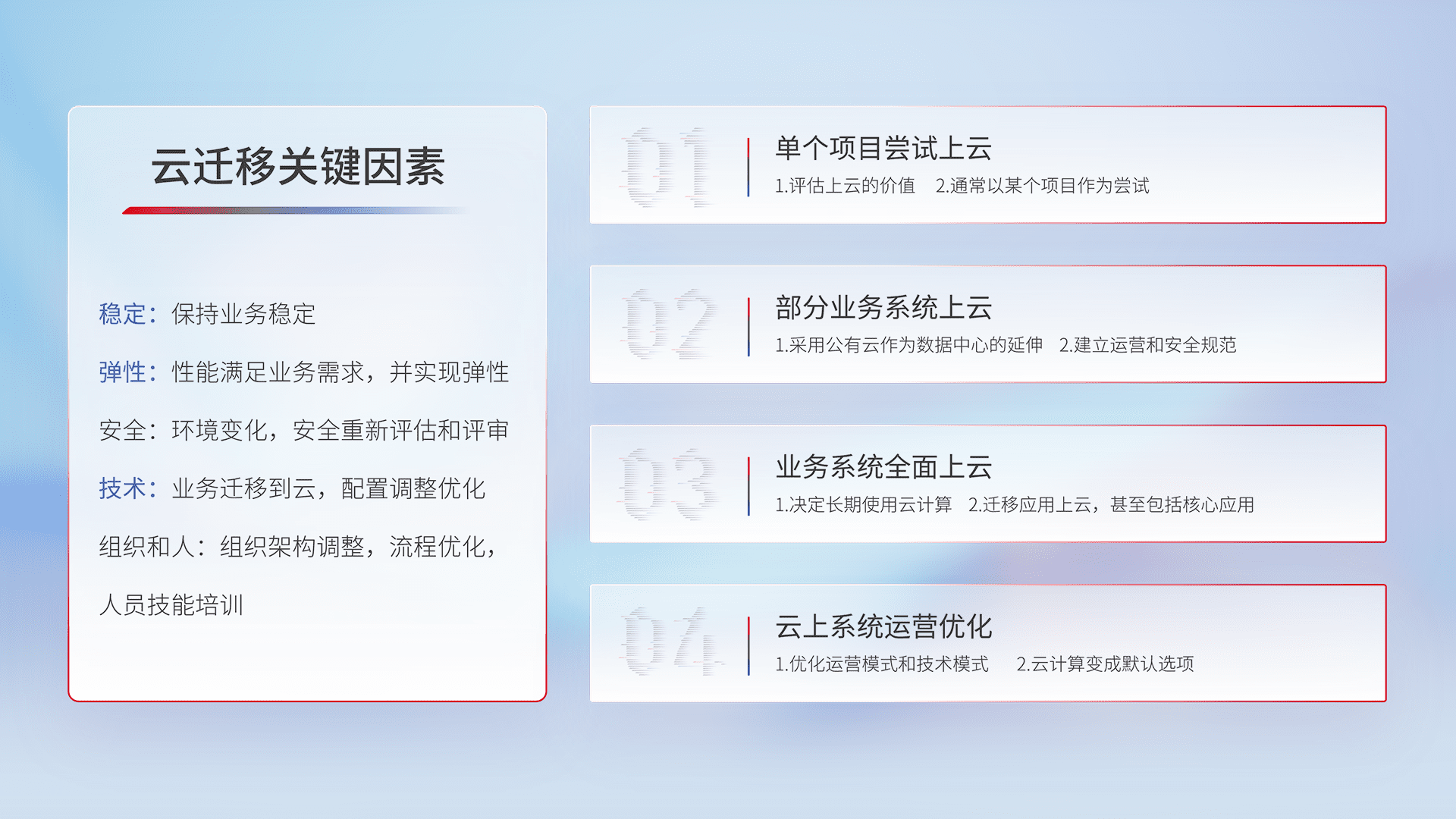 结合实际业务,,,,从规划设计、、、、云平台选型、、、云原生改造、、、数据迁移、、集成交付,,迁移全过程为客户识别最佳上云路径,,,做好风险识别管理,,,设计网络架构、、、身份权限、、安全审计合规、、操作审计、、日志审计、、、监控告警策略、、多站点容灾设计等,,对云上基础设施进行整体规划,,,,提升IT治理水平,,以满足弹性、、、高可用、、、、高性能的需求。。。。