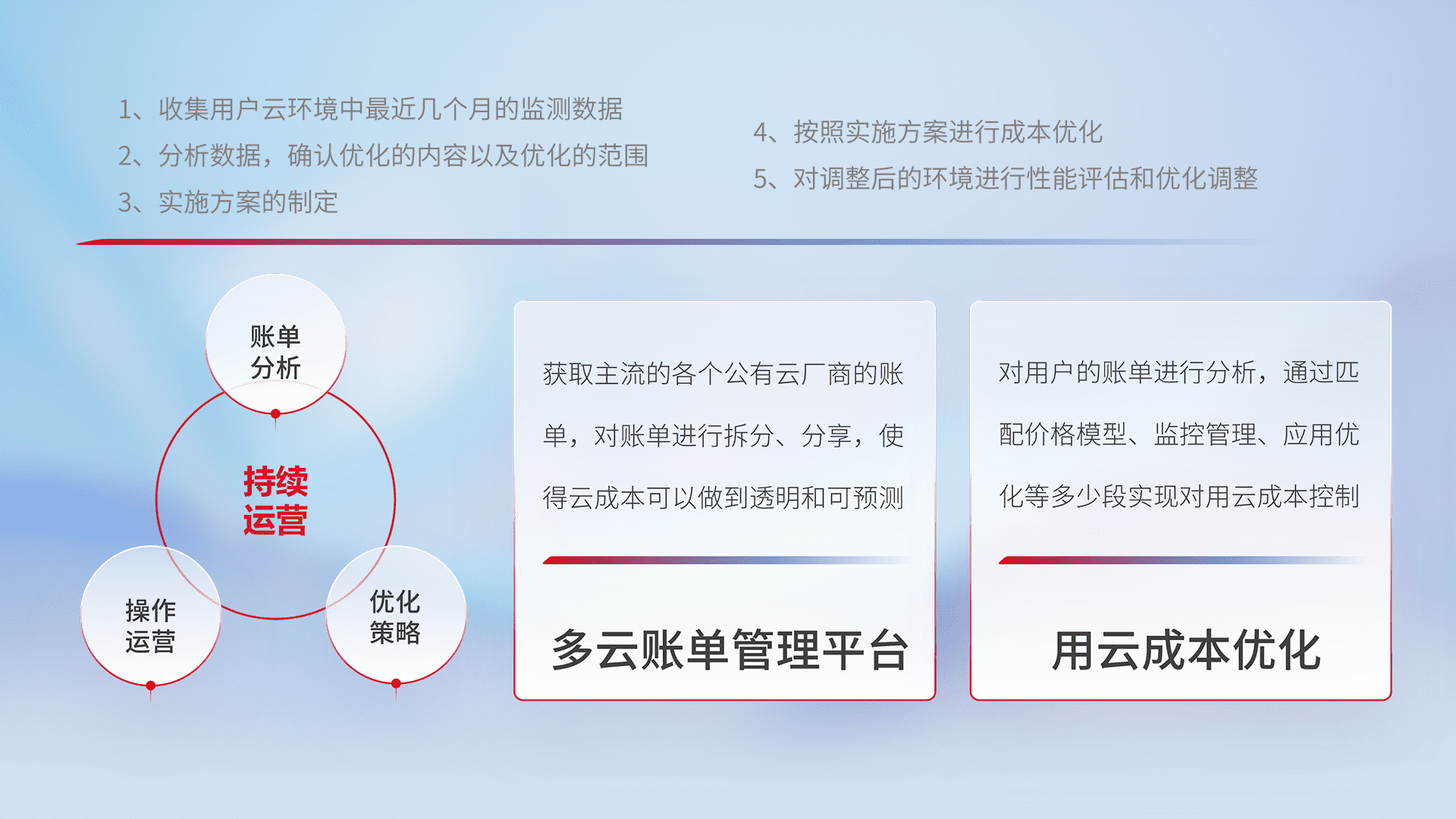 通过多云纳管,,以统一的资源数据模型把客户的云资源进行抽象和封装,,进而实现对多云资源的统一操作,,,,保障云资源管理的可靠性、、稳定性与可用性。。。。量身定制化运维内容,,,,配置、、、开发运维、、、补丁管理、、、、备份、、、监控、、、认证和访问管理、、审计和日常巡检等,,,保障在用云过程中的可靠度,,,稳定度以及高可用率。。